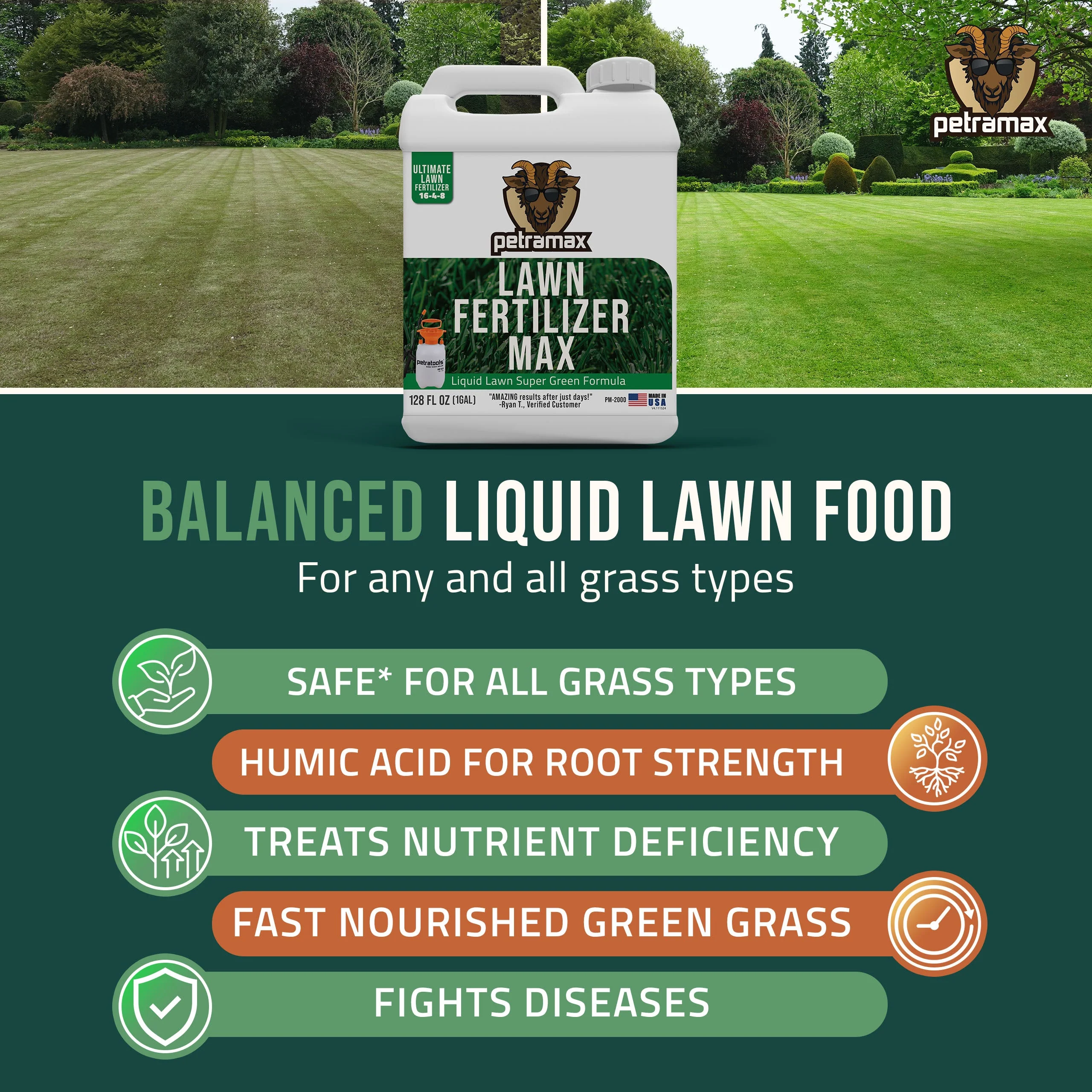 PetraMax 16-4-8 Liquid Fertilizer for lawns combines 16% nitrogen for that deep-green color you want, 4% phosphorus for root strength, and 8% potassium for heat tolerance & overall resilience.